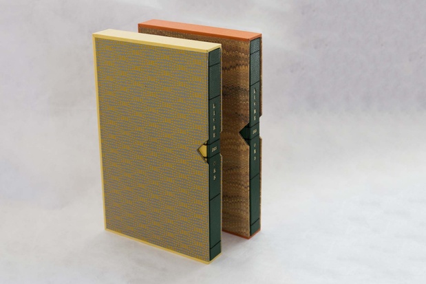 Série de reliures belges (Criss Cross binding) en papier et cuir. Rehauts à l'or de différentes teintes. Cuir et papier fournis par le client.