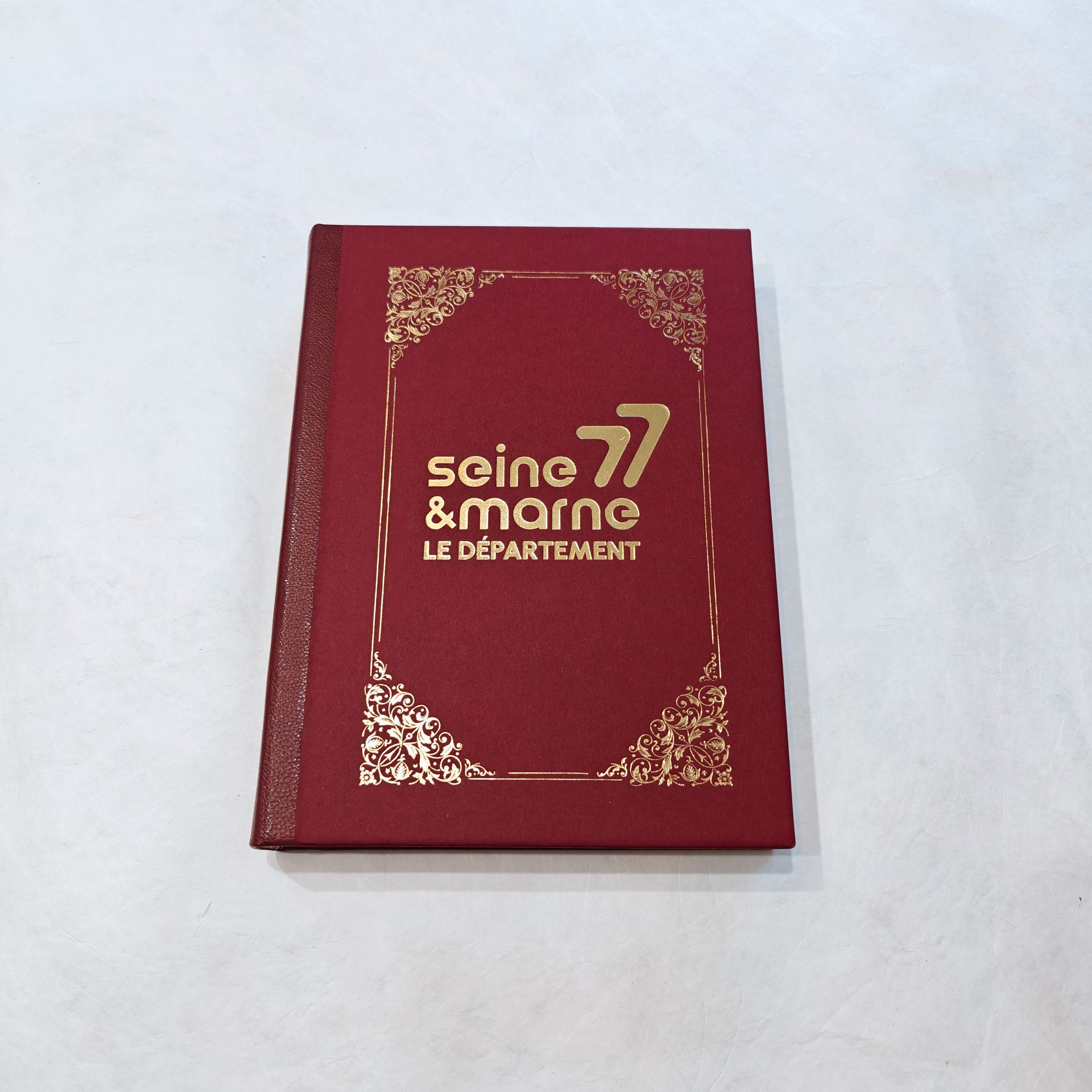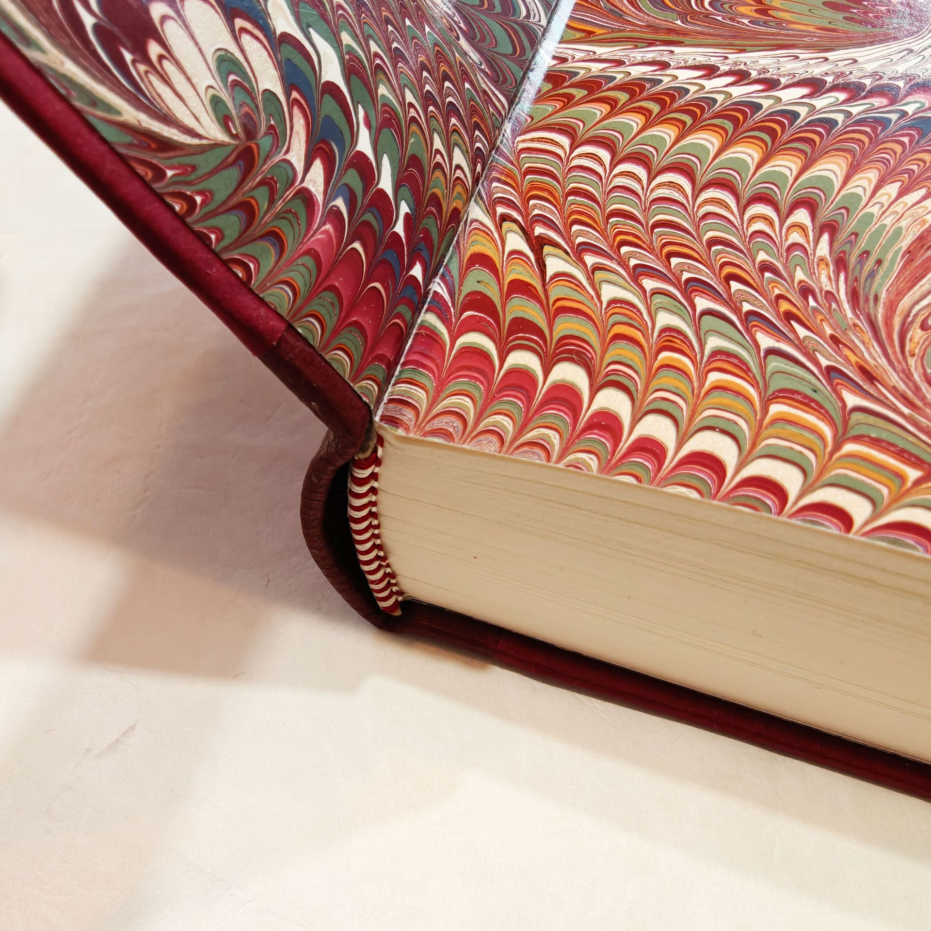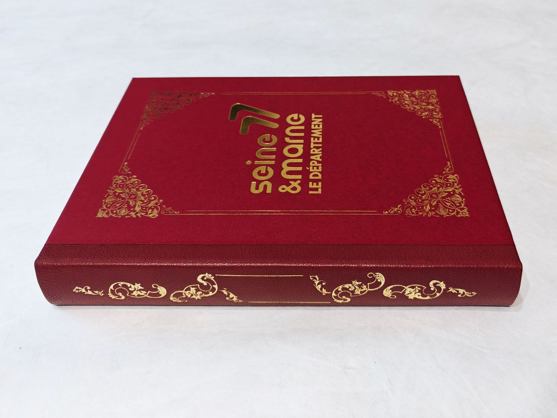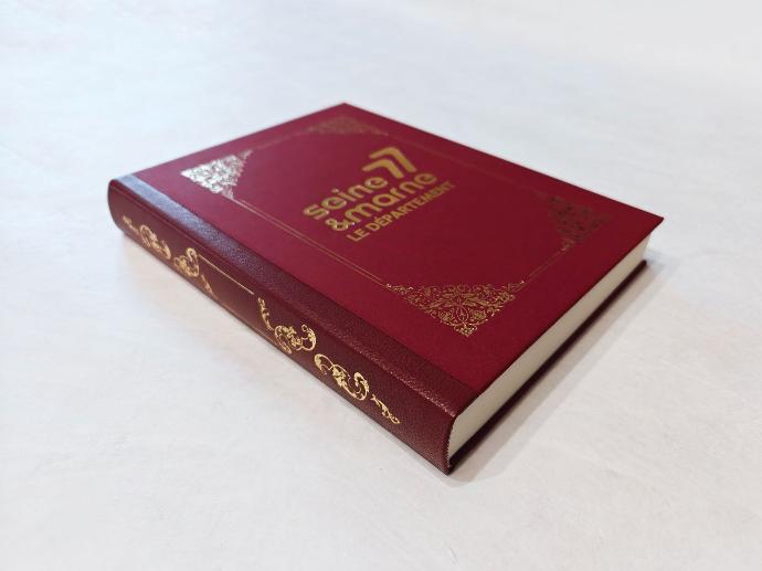 Reliure style emboitage en demi-cuir (chagrin bordeaux) et papier, avec dorure à la plaque pour le logo et une partie de l'encadrement. Dorure aux petits fers pour le dos du livre. Tranchefile main en cordonnet de soie. Intérieur en papier Arches blanc.