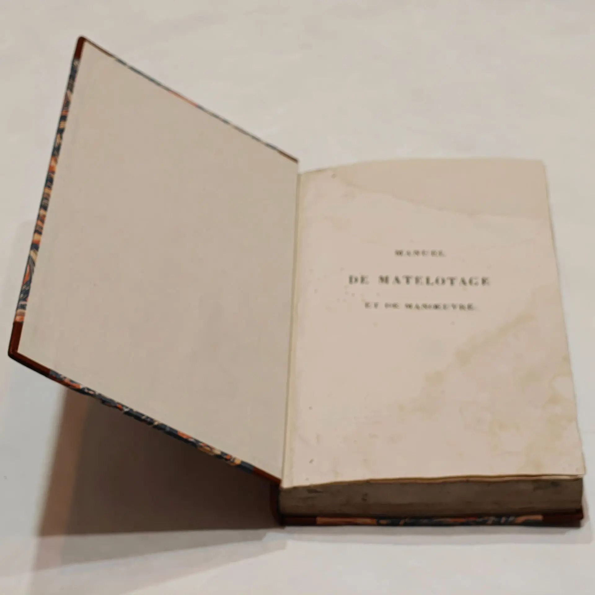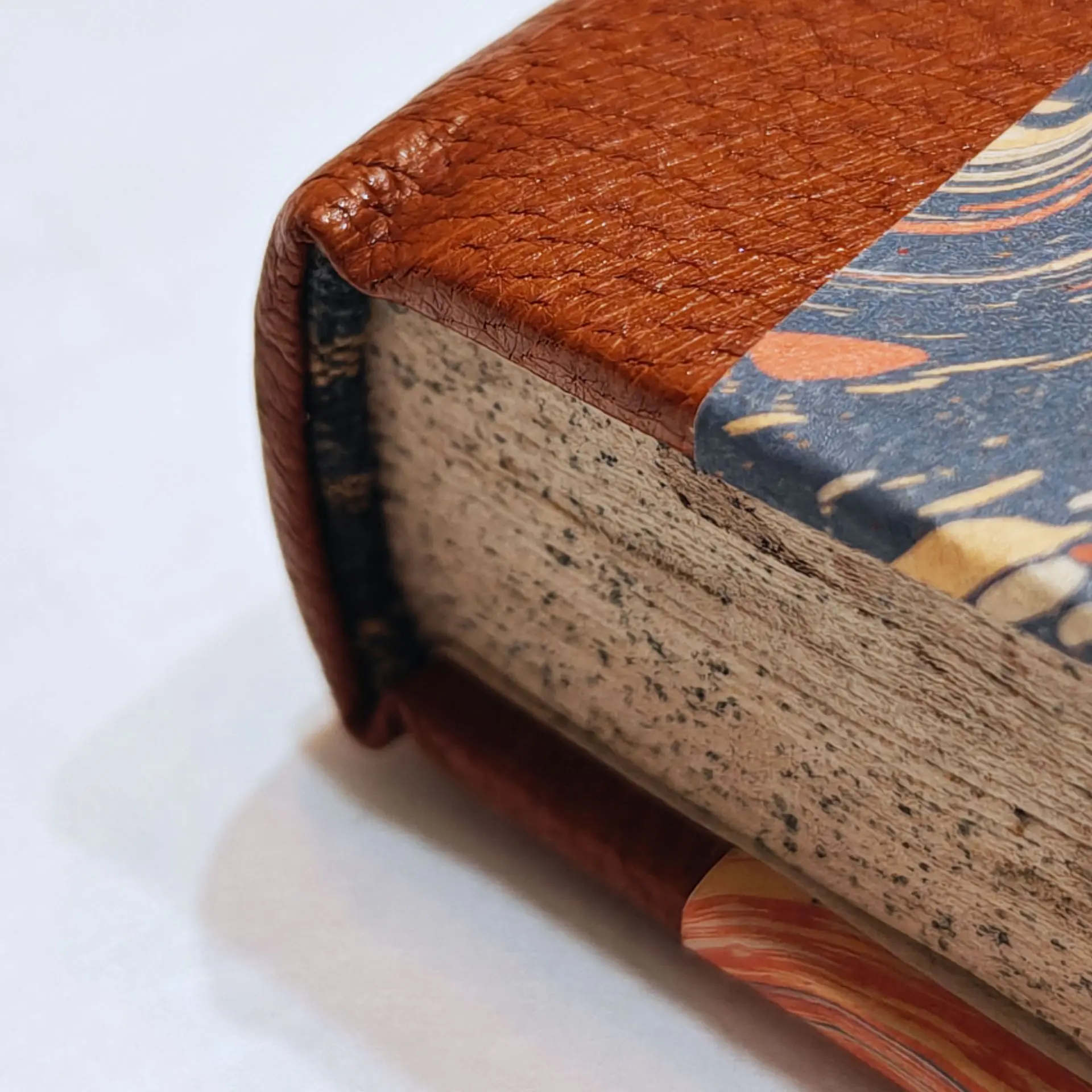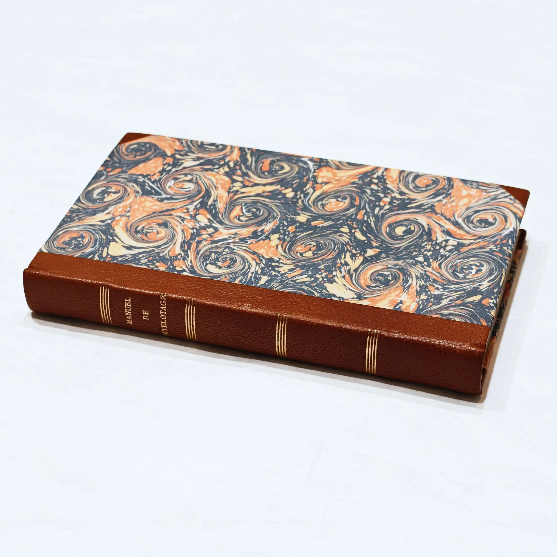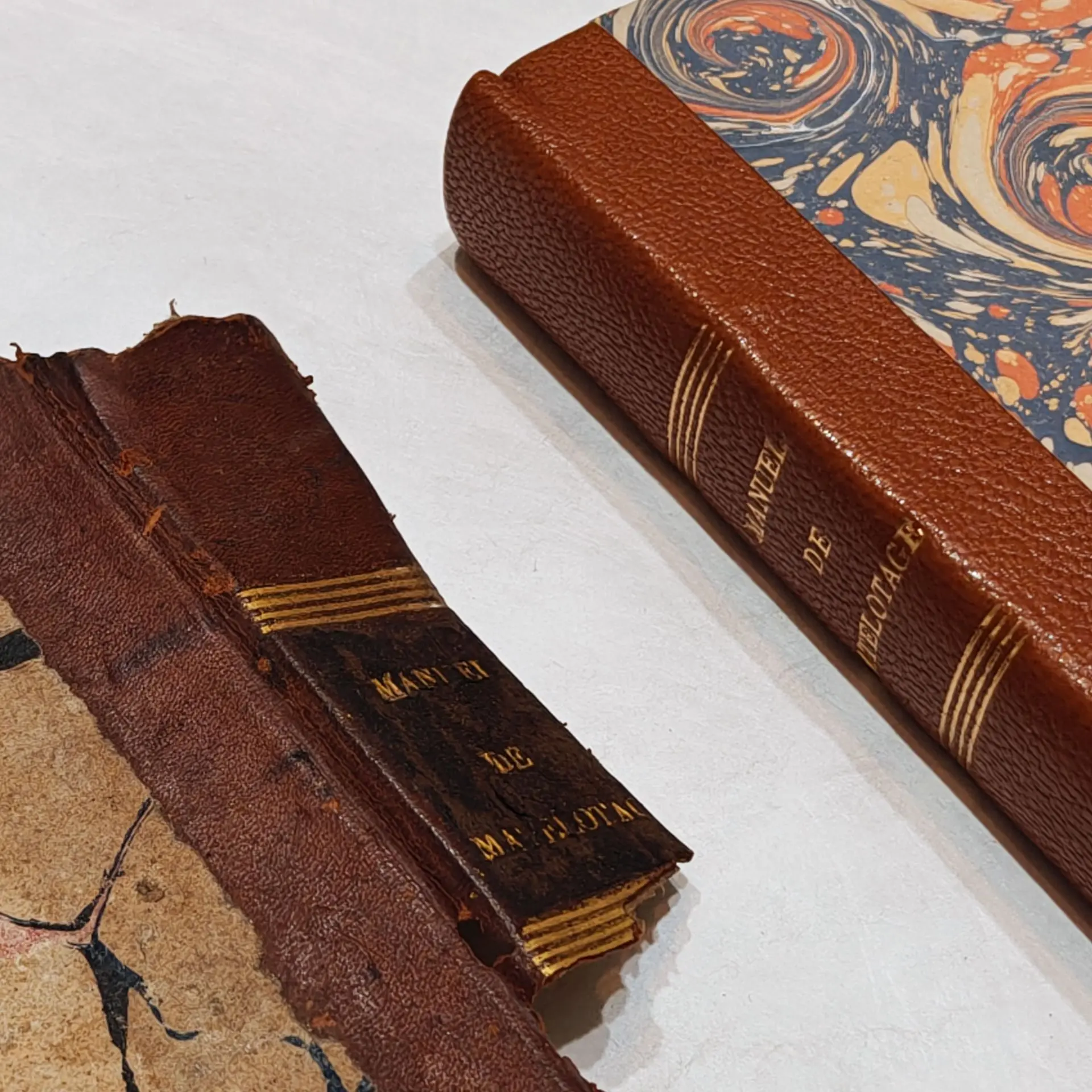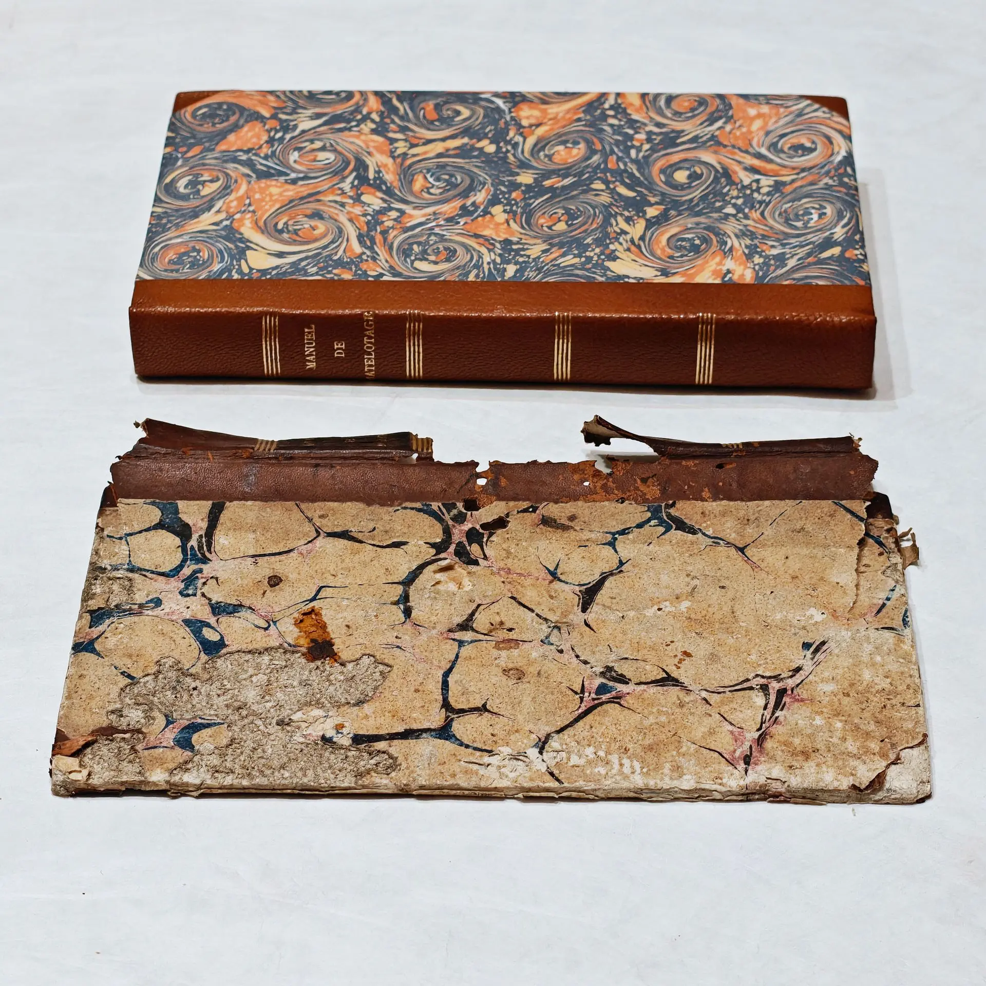 Rénovation d'une reliure ancienne dont la couverture ne faisait plus son office (parcellaire, rongée, coins inexistants), avec reprise de l'ancien corps d'ouvrage (récupération des anciennes ficelles, des anciennes tranchefiles). Couverture en demi-cuir à coins (chagrin) suivant modèle, papier marbré avec motif d'époque. Reprise des gardes intérieures.